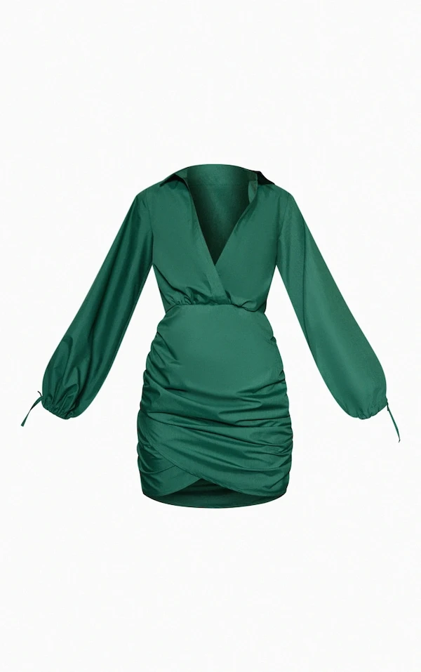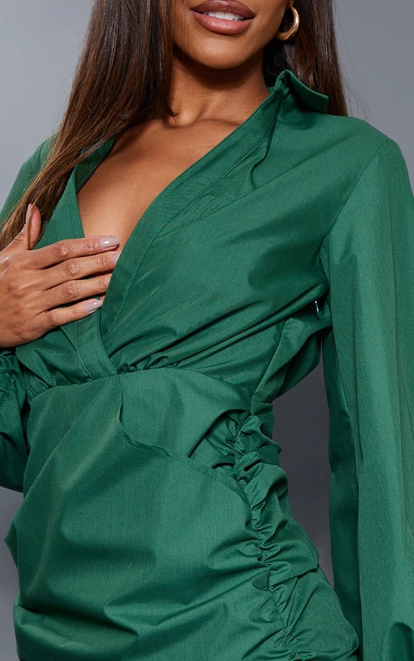 Robe chemise moulante décolletée vert forêt froncée à manchettes nouées