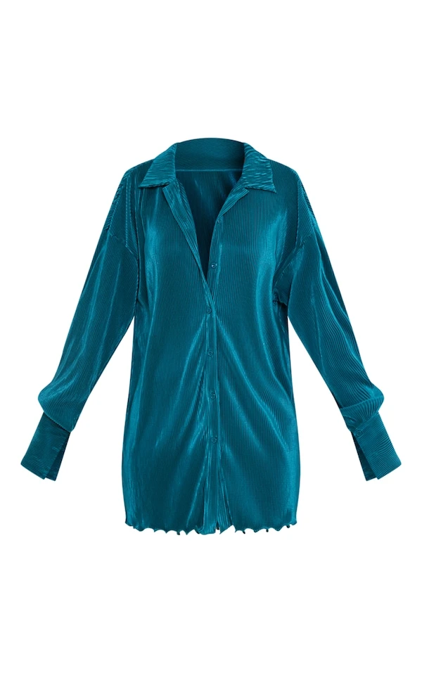 Robe chemise plissée bleu sarcelle à ourlet volanté