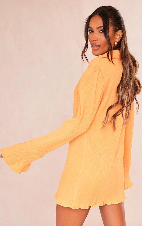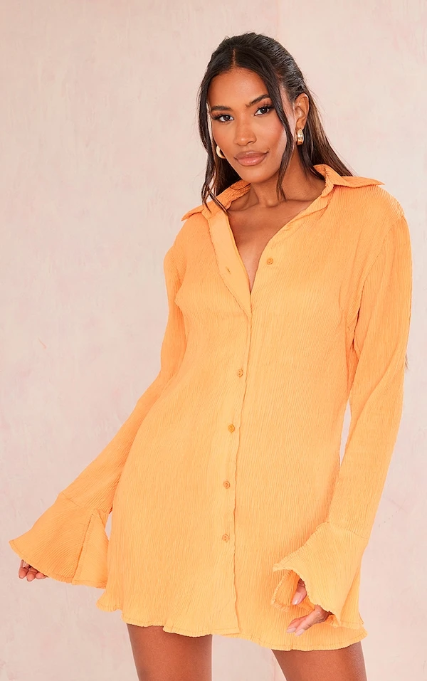 Coup de coeur sur cette robe chemise ! On adore sa couleur mandarine, ses manches flare canon et son effet plissé. Pour un look à tomber, elle se porte avec une paire de sandales et quelques bijoux dorés. Vous avez tout compris à la mode, vous !