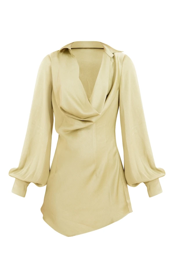 Robe-chemise satinée texturée vert sauge à col bénitier détaillé