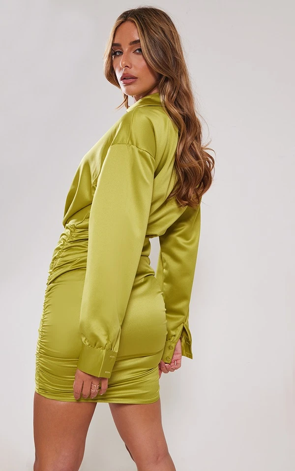 Robe chemise vert olive satinée à décolleté et jupe froncée