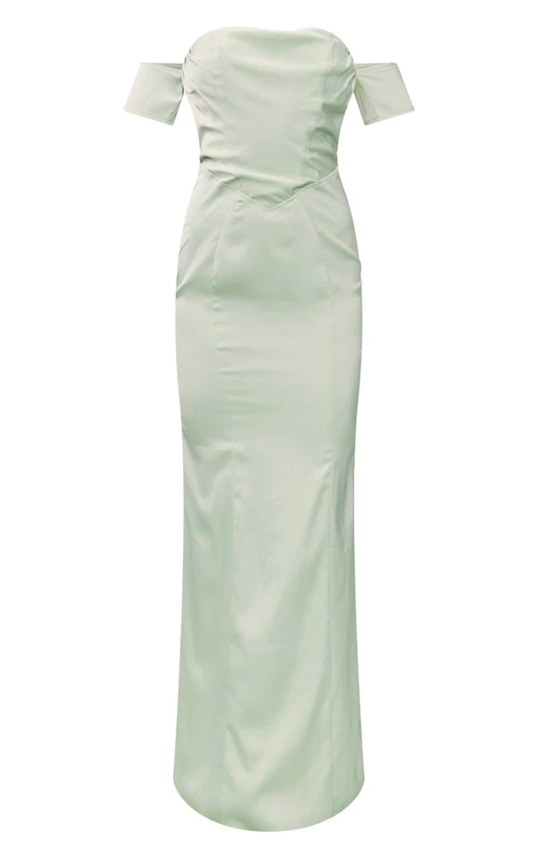 Robe-corset longue vert sauge à dos nu découpé et col bardot