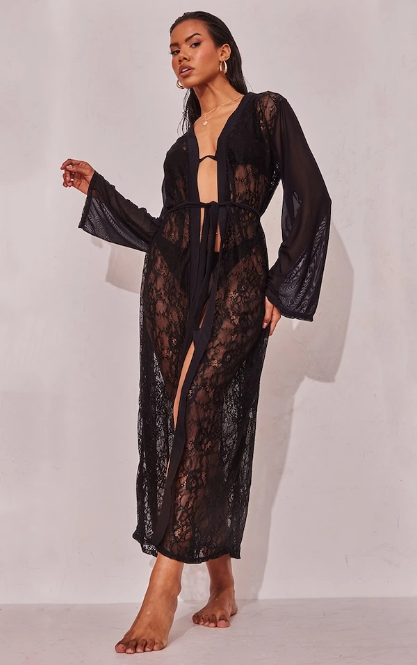 Robe de chambre longue en dentelle noire à manches volantées