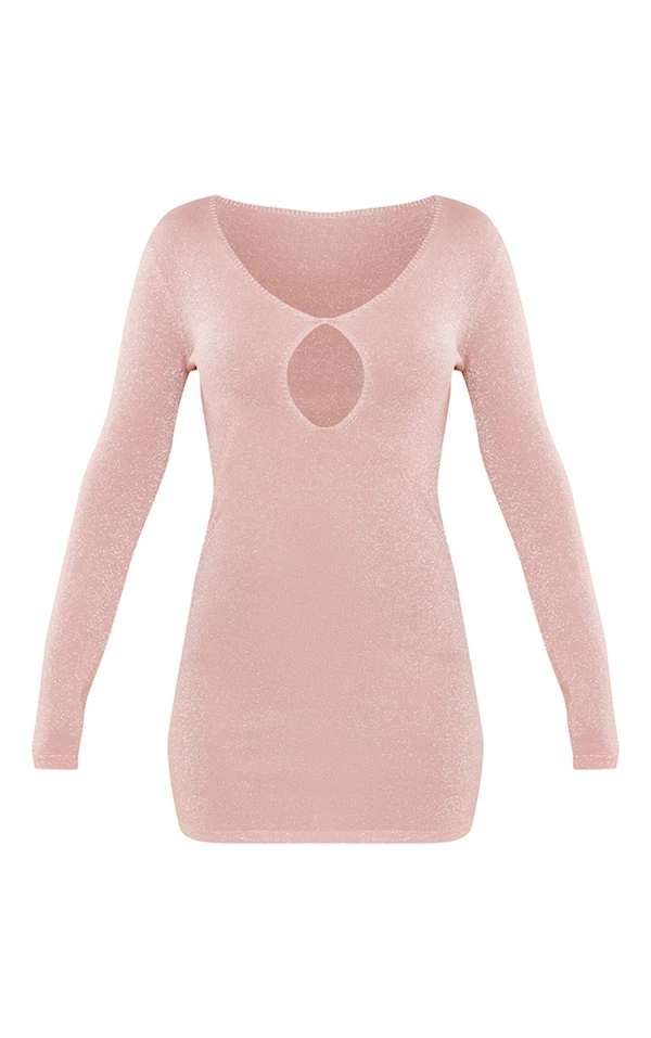 Robe découpée rose tendre en maille tricot pailletée et décolleté plongeant