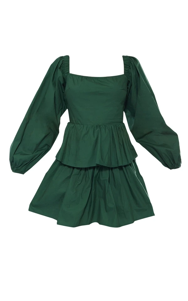 Robe droite en coton vert forêt à étages et manches longues détail dos noué
