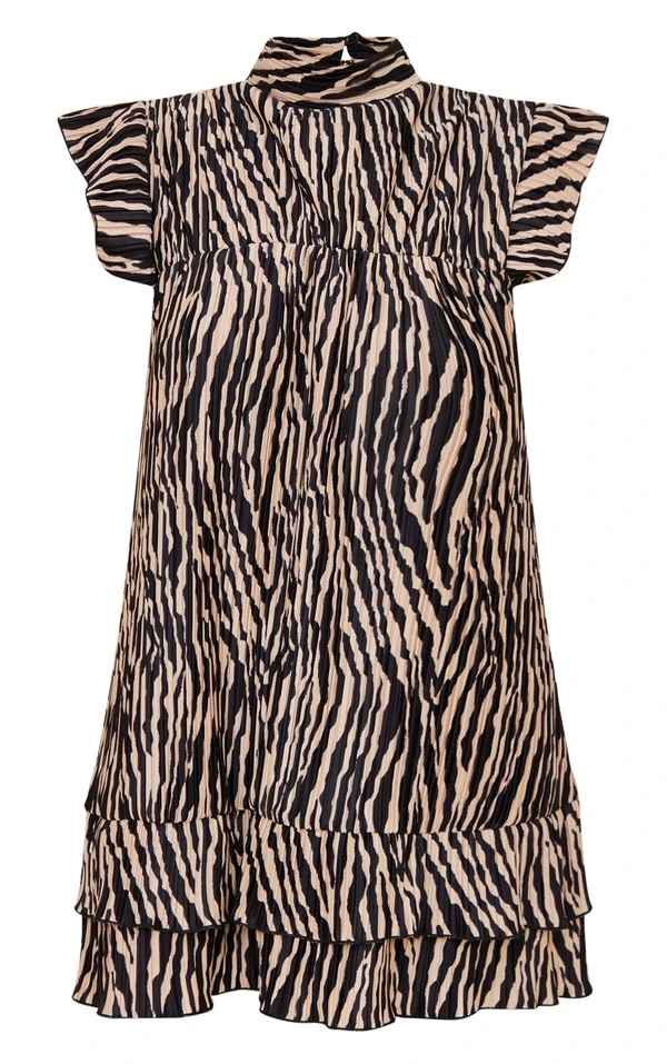 Robe droite plissée noire imprimé zèbre à manches volantées
