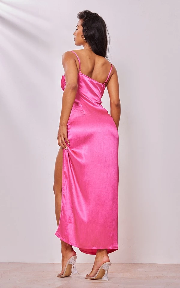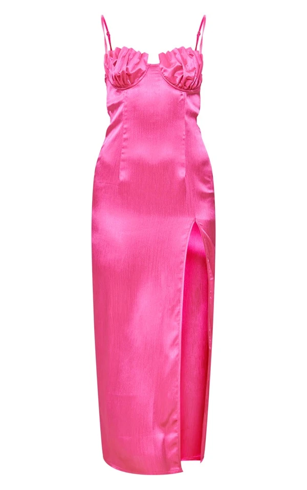 Robe fendue longue texturée rose vif satinée à bonnets plissés et bretelles