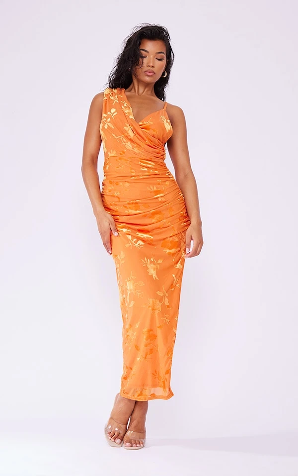Robe fendue mi-longue style cache-coeur drapée orange à fleurs dévorées