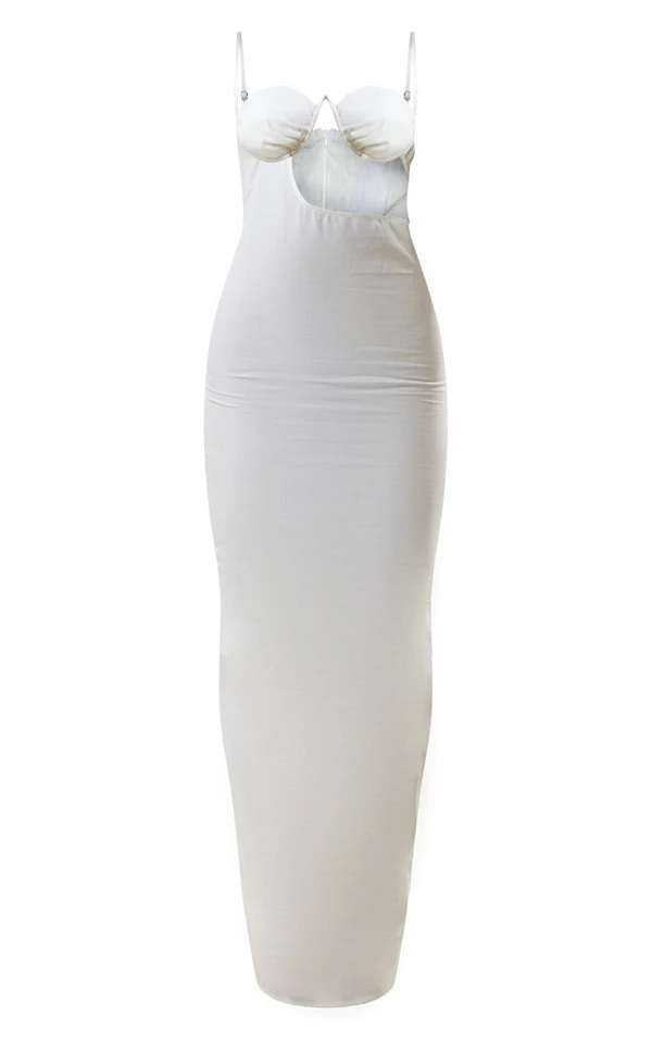 Robe longue blanche en effet lin à côtés découpés et armatures détail bretelles