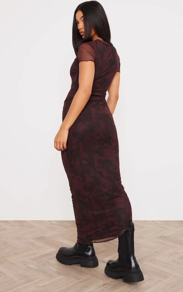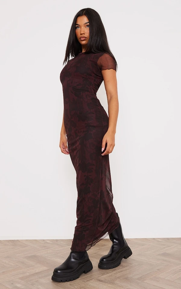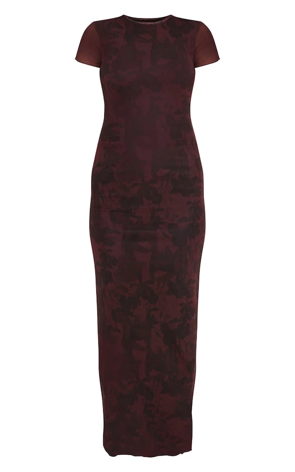 Robe longue bordeaux fleurie en mesh à manches courtes