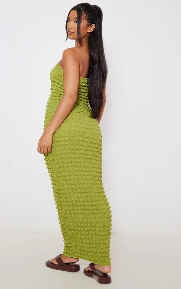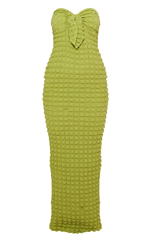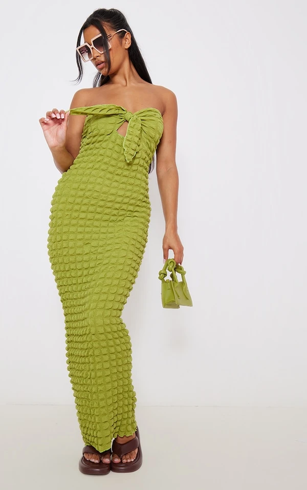 Une robe sur laquelle on crush ! Avec sa matière texturée originale, sa couleur vert olive et son noeud sur le devant, elle ne laisse personne indifférent. Portée avec des sandales et un collier, on se met en mode queen et on fait une entrée remarquée.