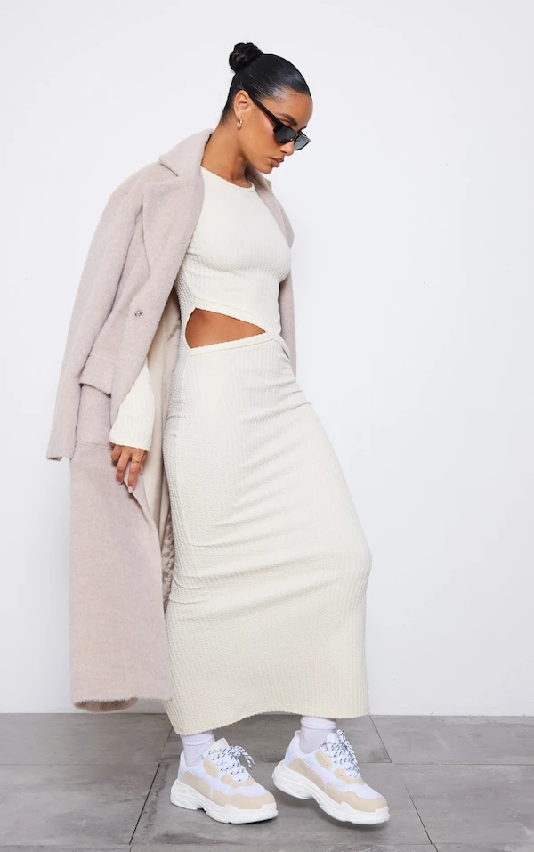 Robe longue côtelée texturée crème à découpes croisées