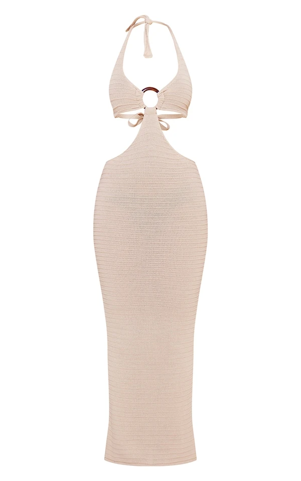 Le crush est infini pour cette robe longue toute simple ! Avec sa couleur crème, sa maille tricot et son anneau sur le devant, elle nous a fait craquer. Il ne manque que des sandales et un sac en osier pour le look final !