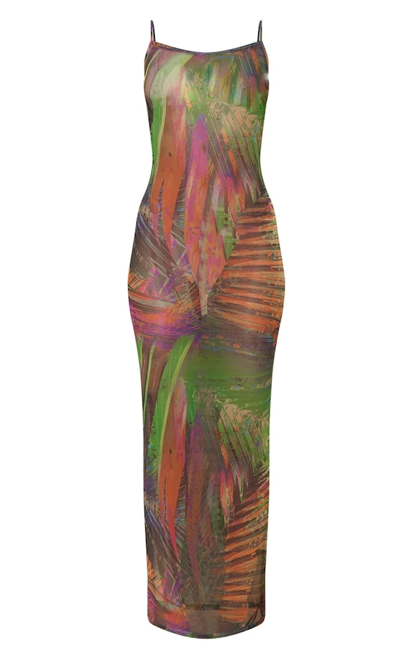 Robe longue en mesh multicolore à imprimé tropical et bretelles