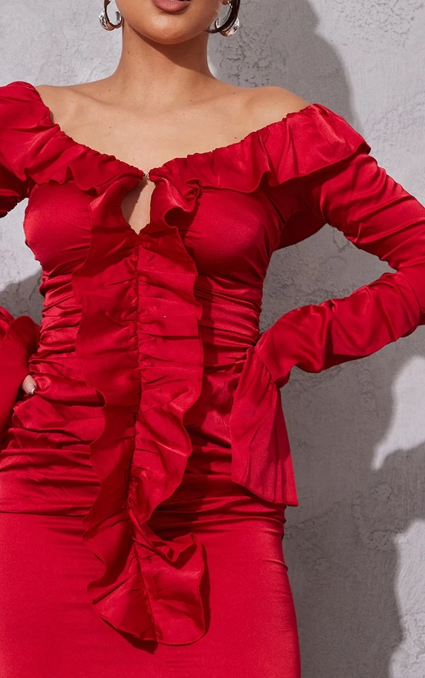 In love de la couleur rouge de cette robe. Avec sa longueur, ses manches longues et l’effet froncé de sa matière à volants, on l’adore. En soirée, portez-la avec une paire de mules et quelques accessoires pour attirer tous les regards sur vous !