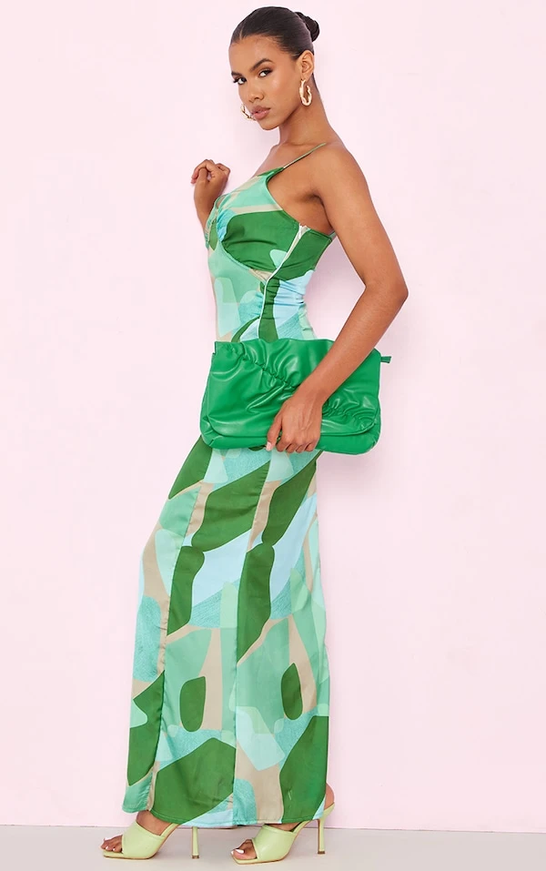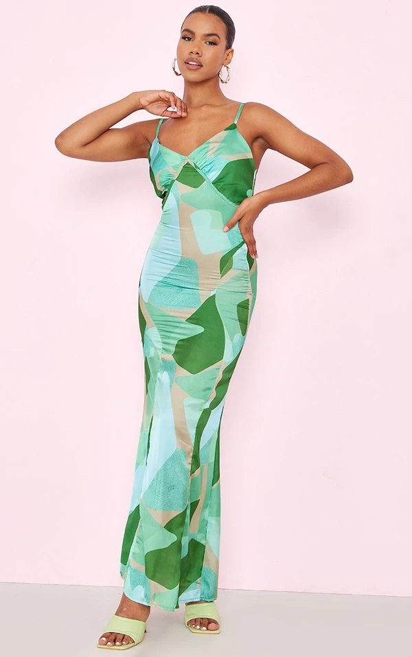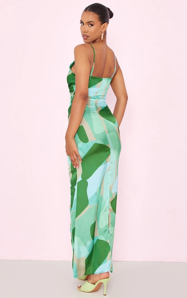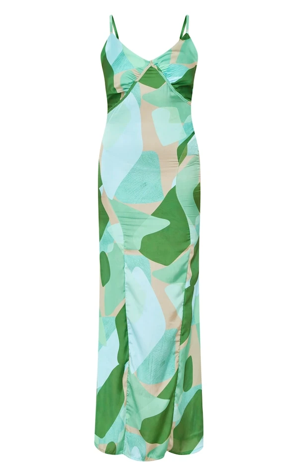 Robe longue imprimée abstrait vert à bretelles et détail buste