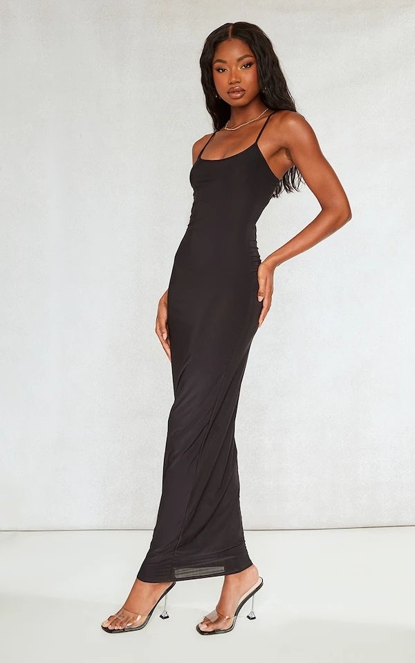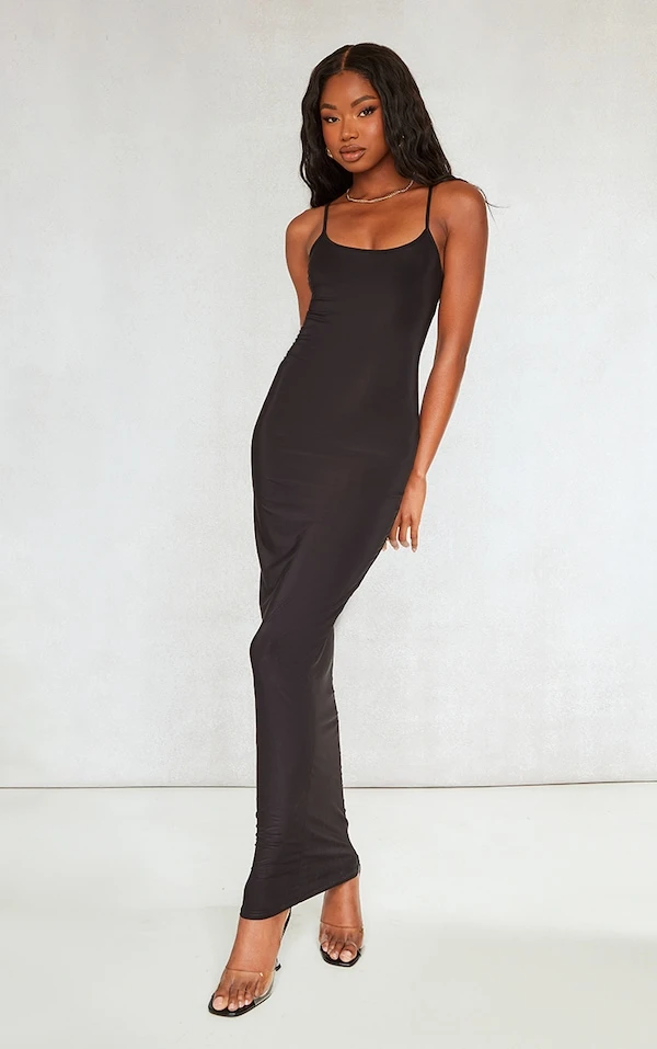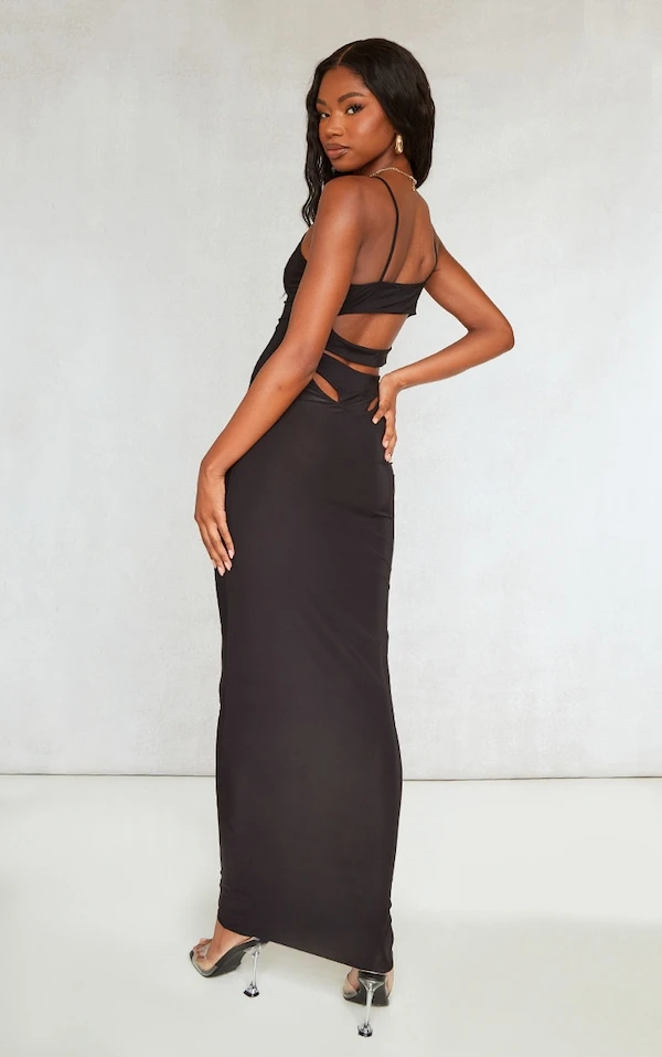 Robe longue moulante noire découpée dans le dos à col rond et bretelles
