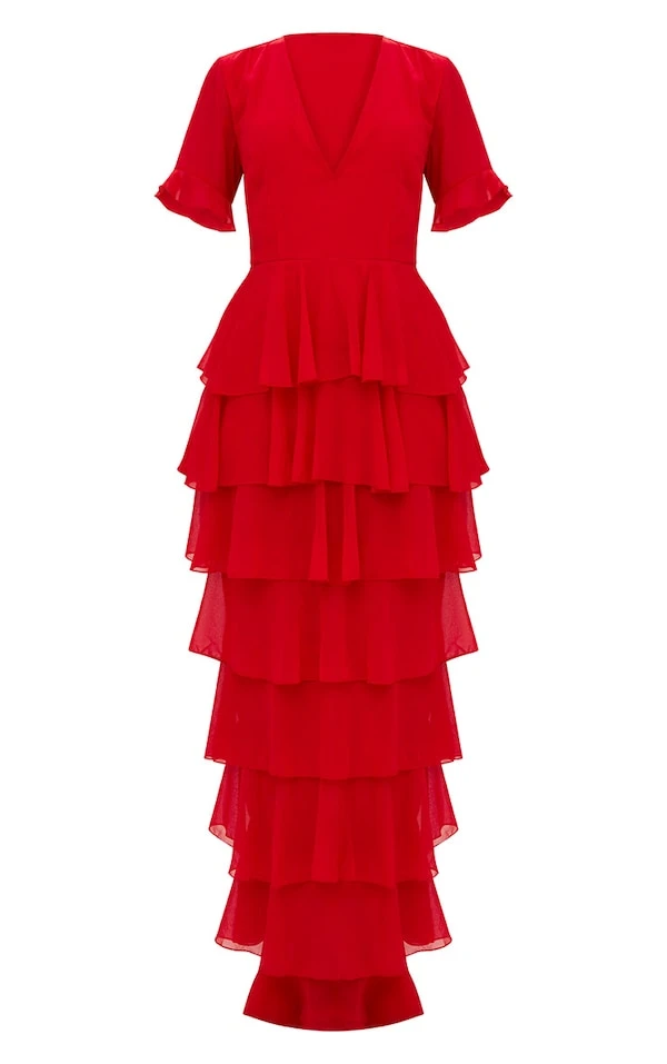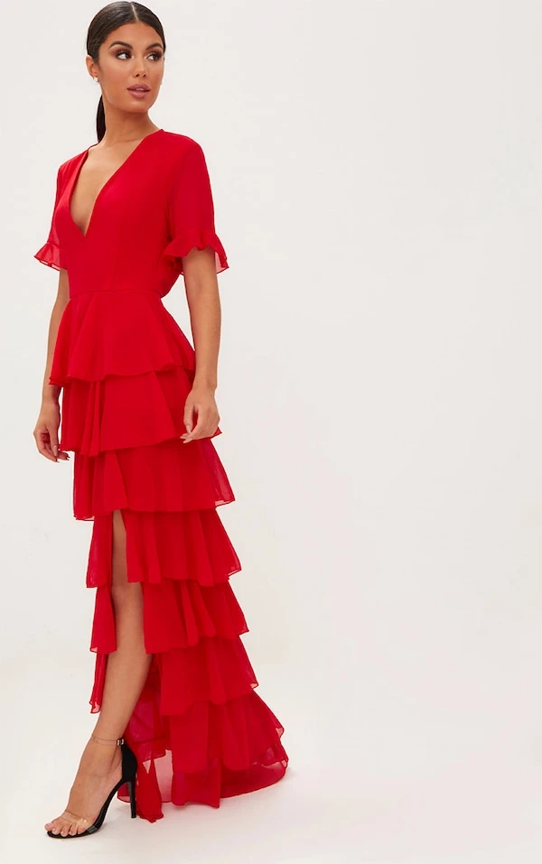 Le mood est très caliente dans cette robe longue! Avec son rouge très fire, ses volants canon et ses manches courtes, elle est parfaite pour vos soirées post-plage. Une paire de talons et go!