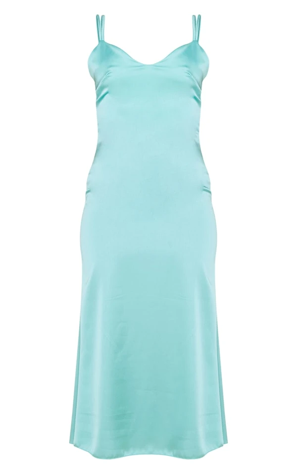 Robe longue satinée bleu cendré à doubles bretelles nouée dans le dos