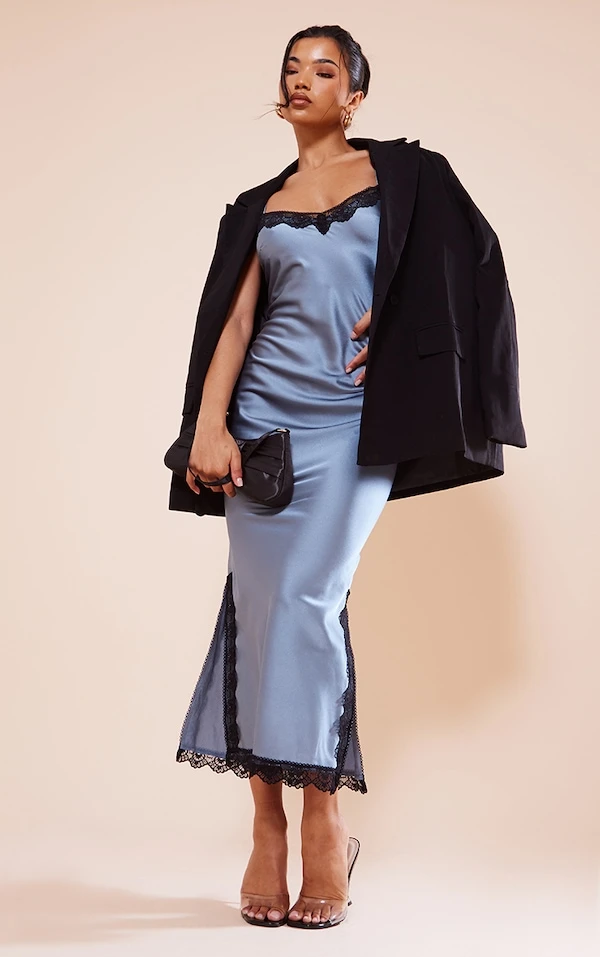 Magnifique, cette robe fines bretelles ! Avec sa coupe longue, sa matière satinée bleue toute douce et son design à bordue en dentelle, elle est parfaite pour un dîner chic. Portez-la avec des talons transparents et un blazer oversize pour un look au top. Effet waouh garanti !