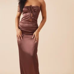 Robe longue satinée chocolat à dos nu et découpes