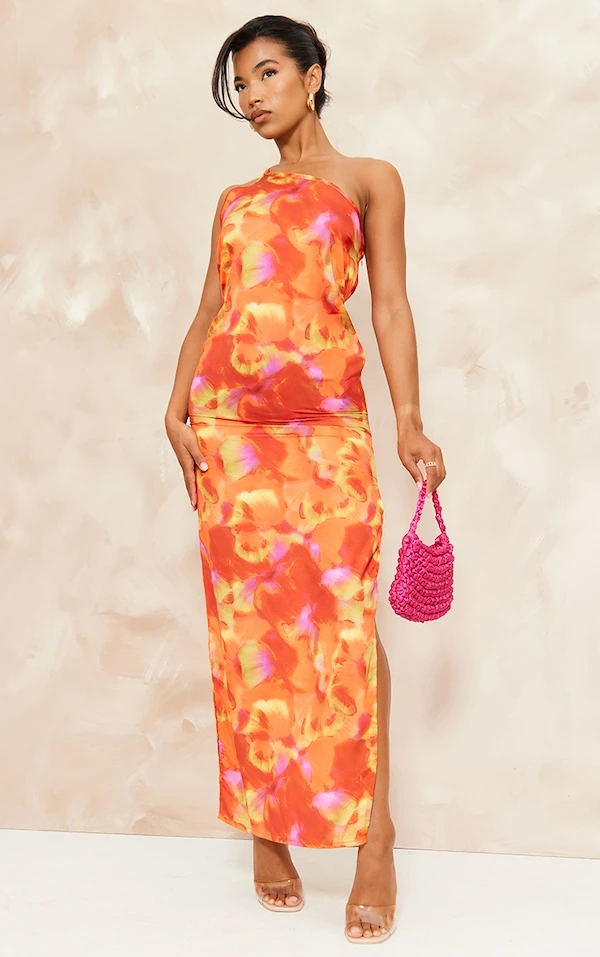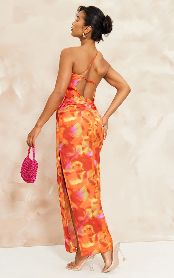 Robe longue satinée multicolore à imprimé abstrait et bretelle dans le dos