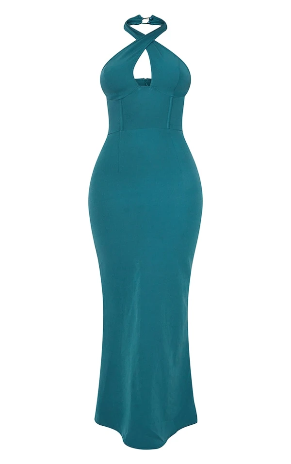Pure beauté dans cette robe longue. Dans son vert émeraude canon et avec son design corset croisé devant, c’est impossible de se louper. Des talons, un sac et go.