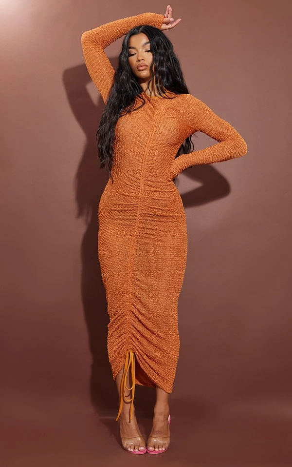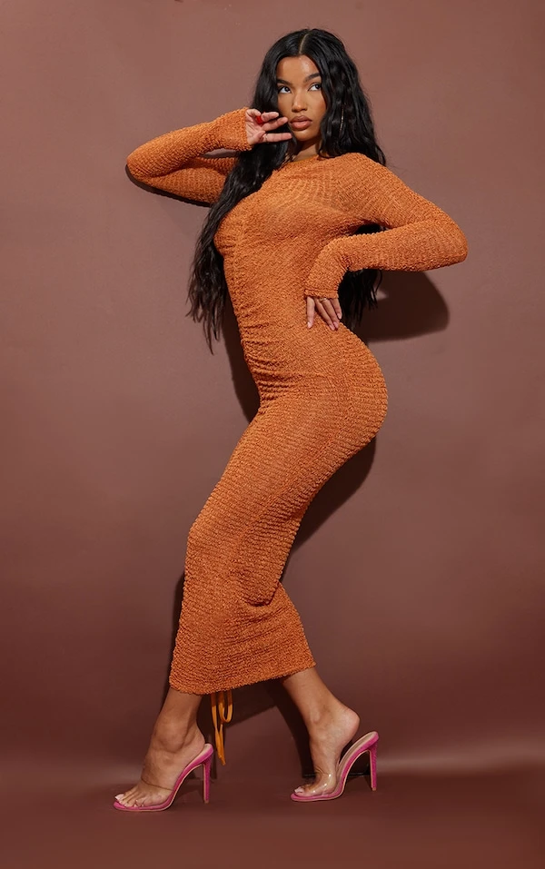 Magnifique cette robe à la matière texturée froncée. Entre son coloris rouille moderne, ses manches longues et son style très près du corps, c’est un mood de déesse en soirée. Plus qu’à enfiler des talons et un petit sac.