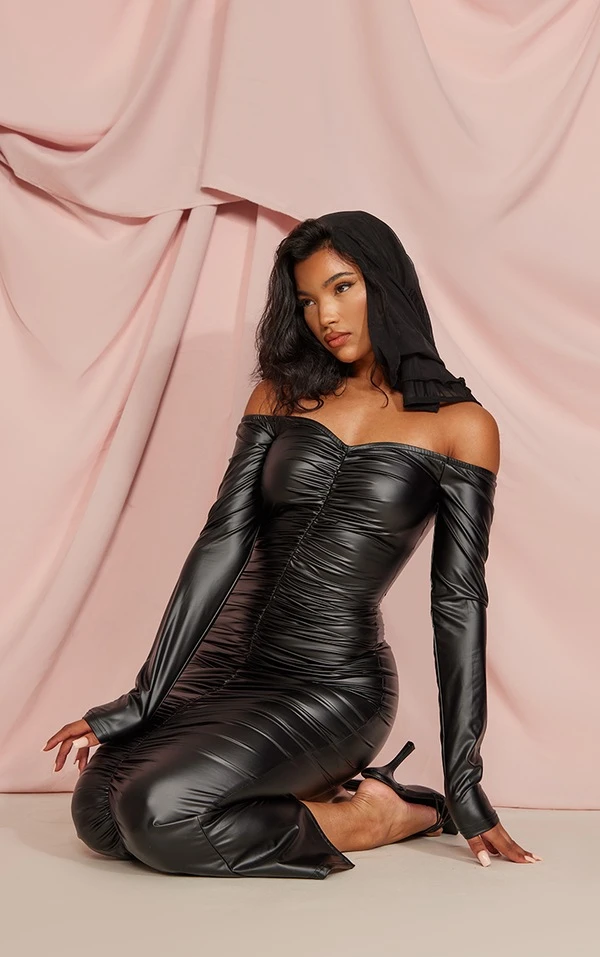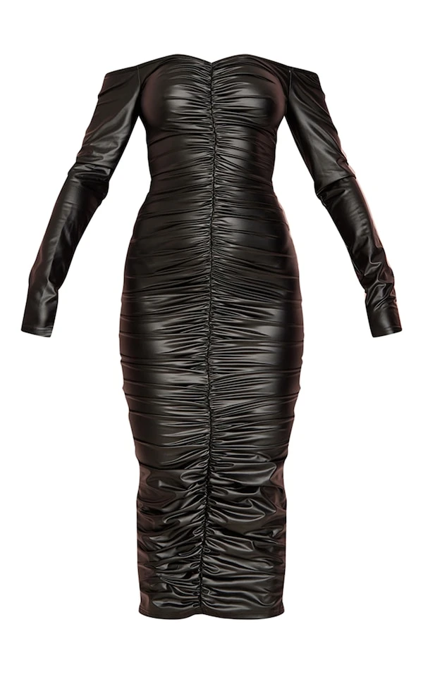 Robe longue très froncée en similicuir noir à col bardot