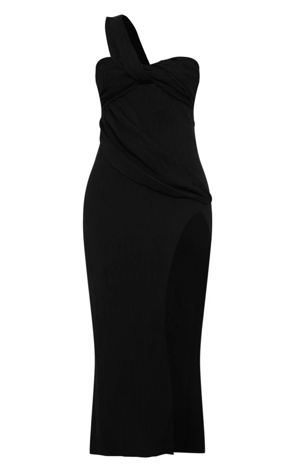 Robe mi-longue asymétrique texturée noire drapée fendue