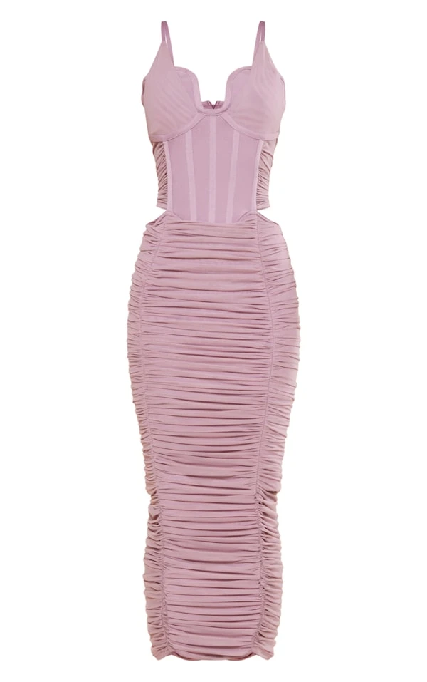 Robe mi-longue bandage froncée mauve à bretelles et corset