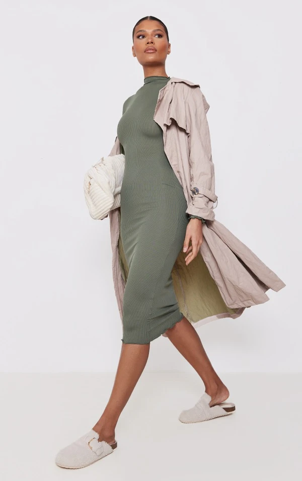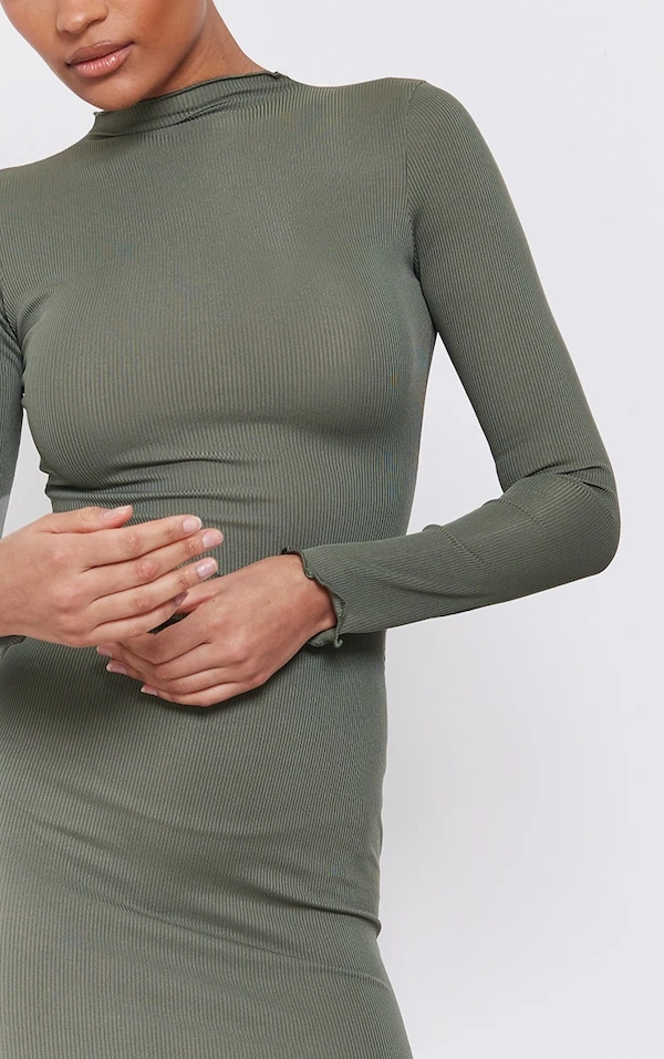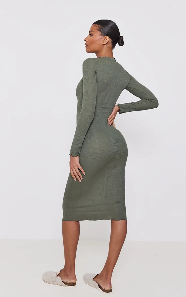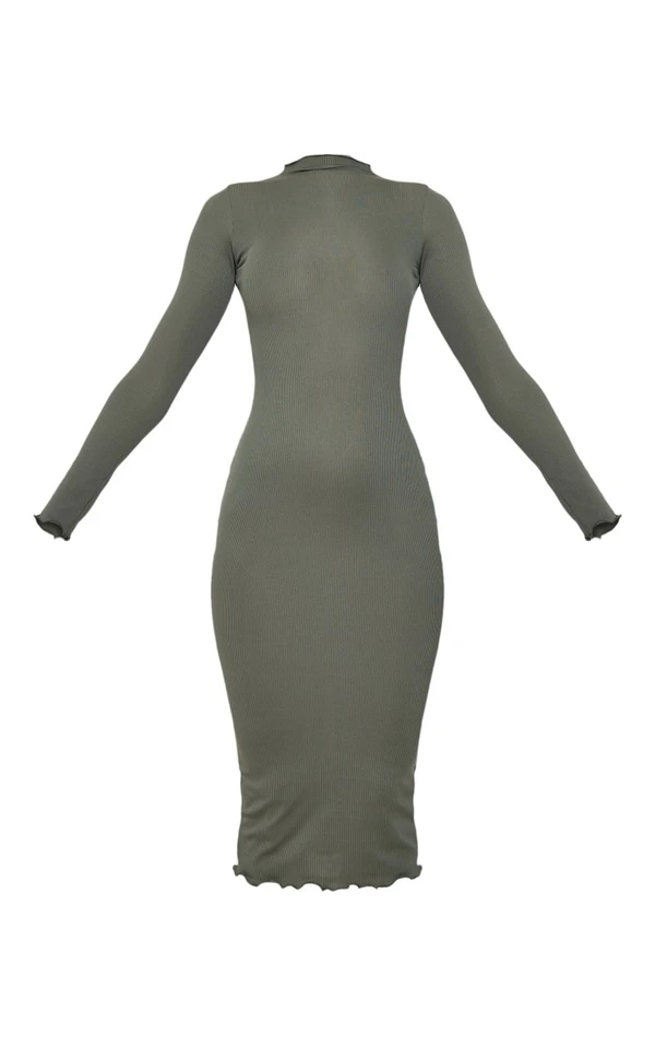 Robe mi-longue côtelée kaki à manches longues et ourlet légèrement volanté