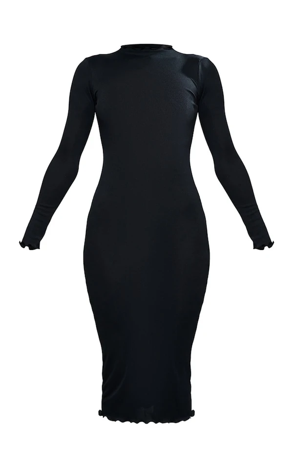 Robe mi-longue côtelée noire à manches longues et ourlet légèrement volanté