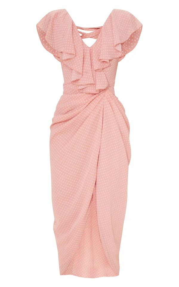 Robe mi-longue drapée rose imprimé pois à dos lacé