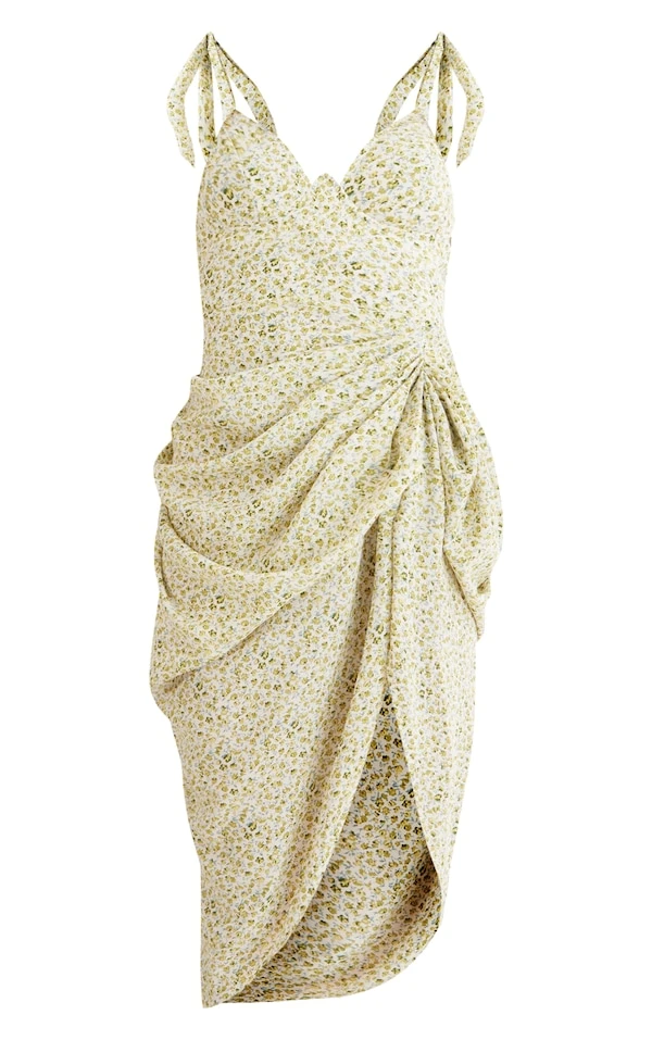 Robe mi-longue drapée verte à petites fleurs et armatures