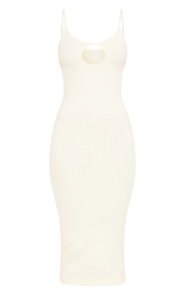 Robe mi-longue écrue côtelée structurée découpée à bretelles et contours