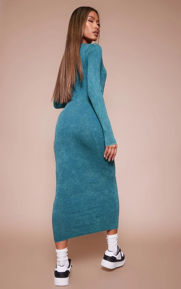Robe mi-longue en coton vert délavé découpée à manches longues