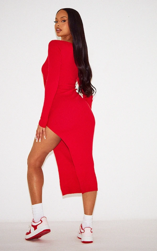 Robe mi-longue en maille rouge à col rond et fente sur le côté