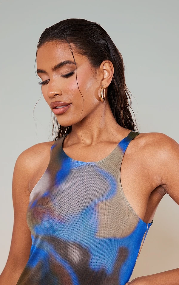Robe mi-longue en mesh bleu imprimé à col montant et dos nageur