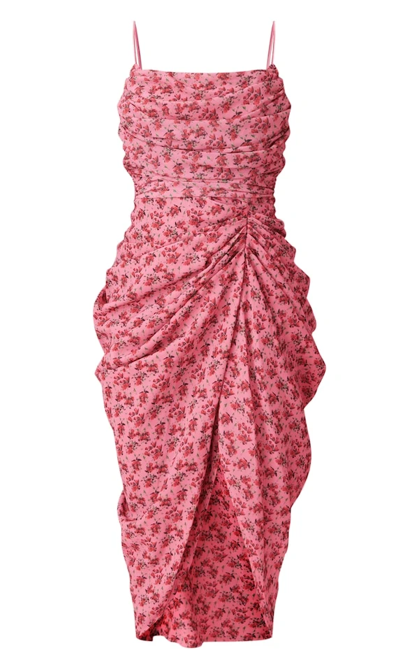Robe mi-longue en mousseline de soie froncée imprimé abstrait rose détail drapé