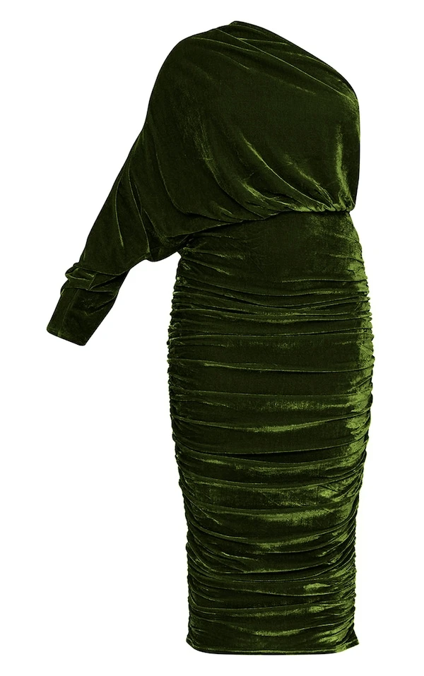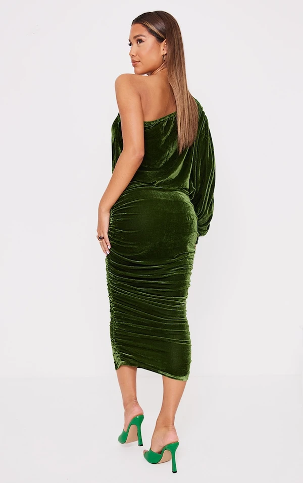 Robe mi-longue en velours froncé vert olive à manche unique