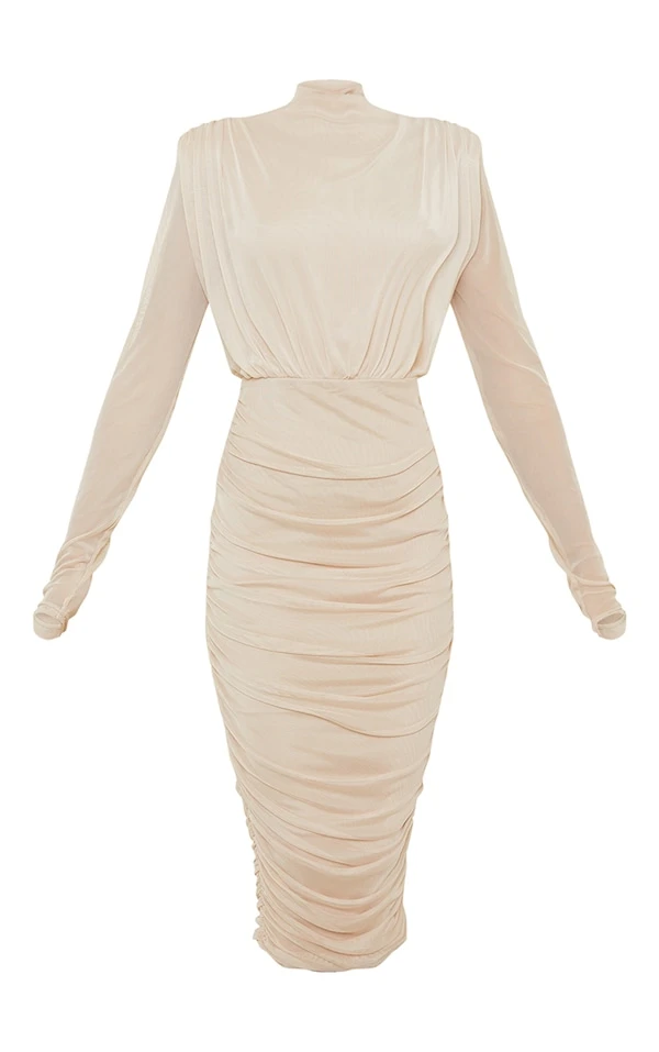 Robe mi-longue froncée en mesh nude à col haut et manches longues