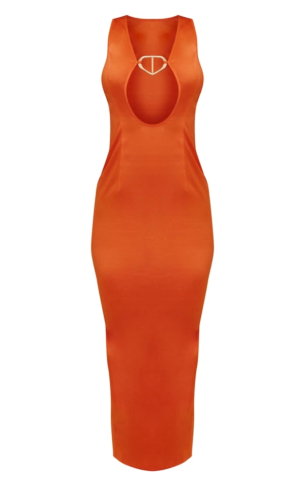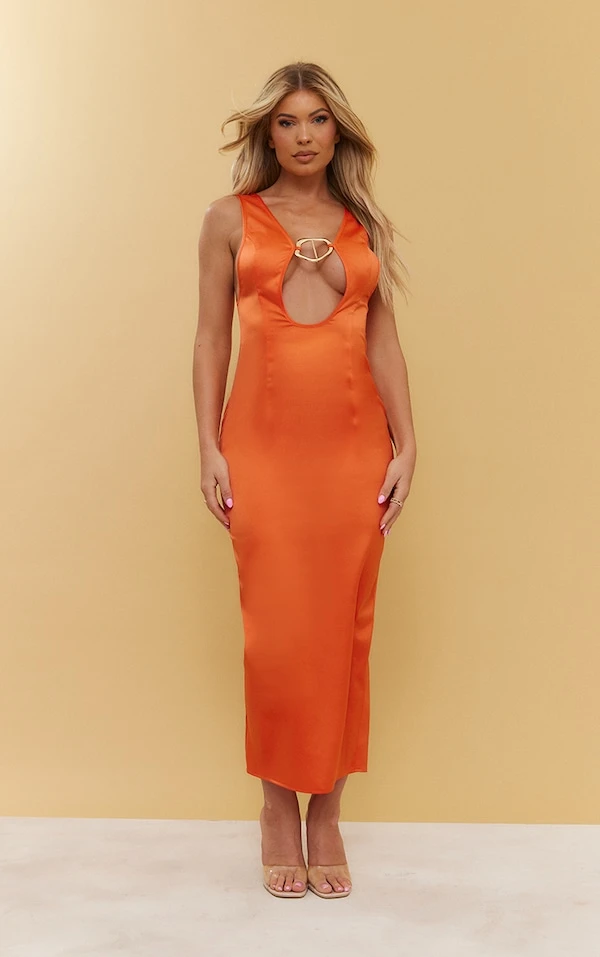 Robe mi-longue mandarine satinée décolletée à bretelles et empiècement