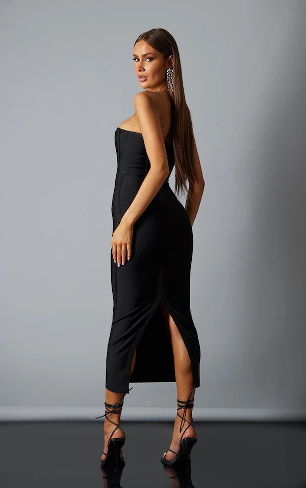 En amour avec cette robe corset à la coupe mi-longue très glamour. Avec sa couleur noire qui se porte avec tout et sa matière bandage, on l’adore. C’est à porter avec une paire de mules et quelques accessoires dorés pour un look de soirée qui met tout le monde d’accord !