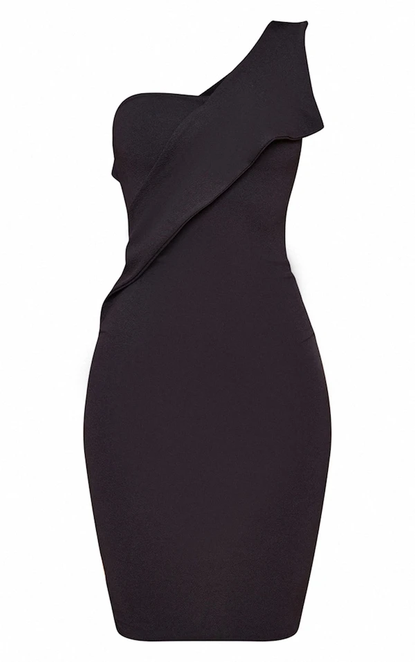 Cette robe à la coupe sobre mais asymétrique fera sensation tout en subtilité. En textile noir moulant avec une bretelle asymétrique et une coupe mi-longue, portez-la avec des talons à brides, on adore.