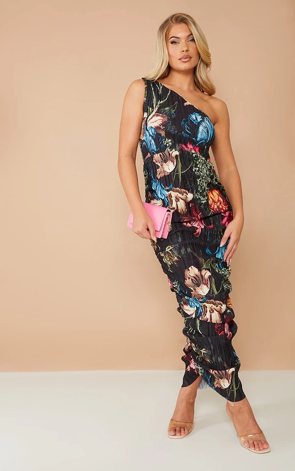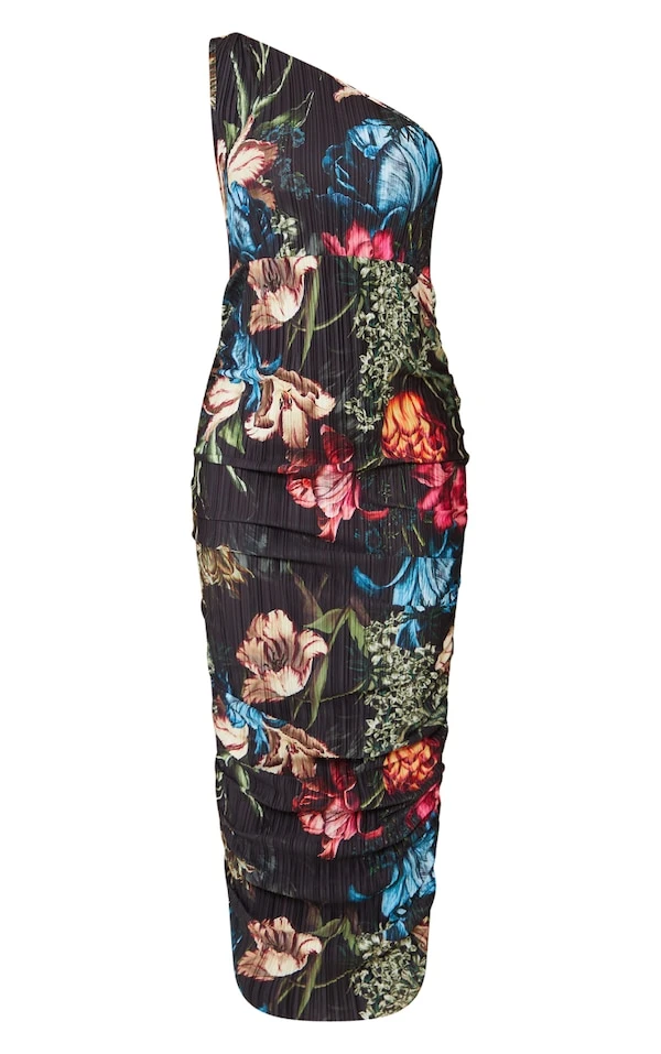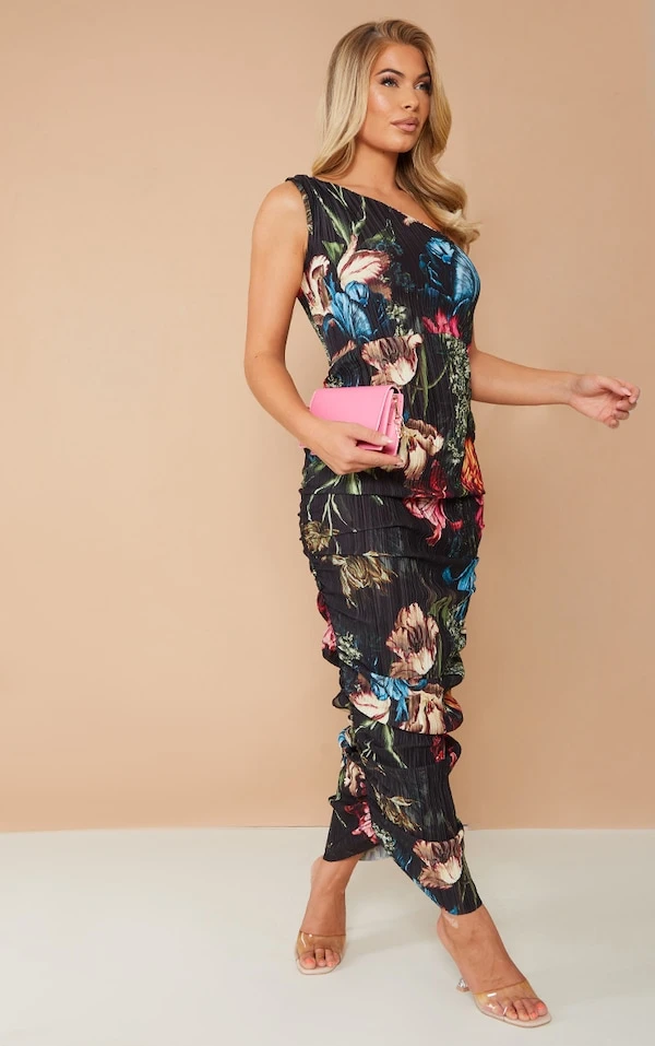 Robe mi-longue plissée froncée imprimé fleuri noire à épaule unique