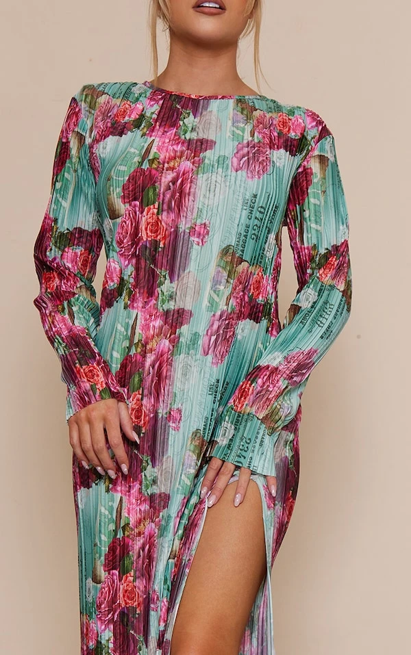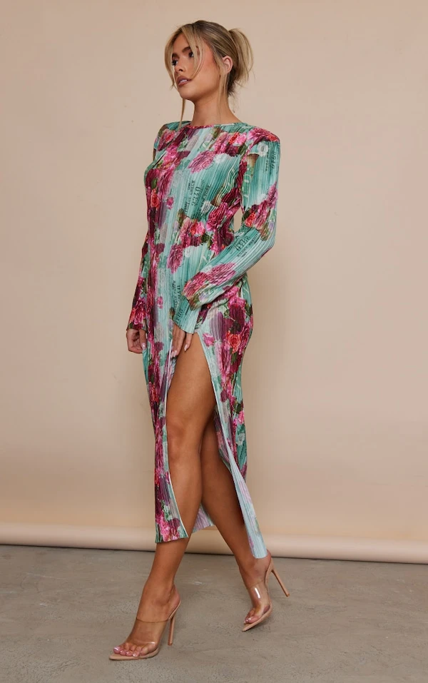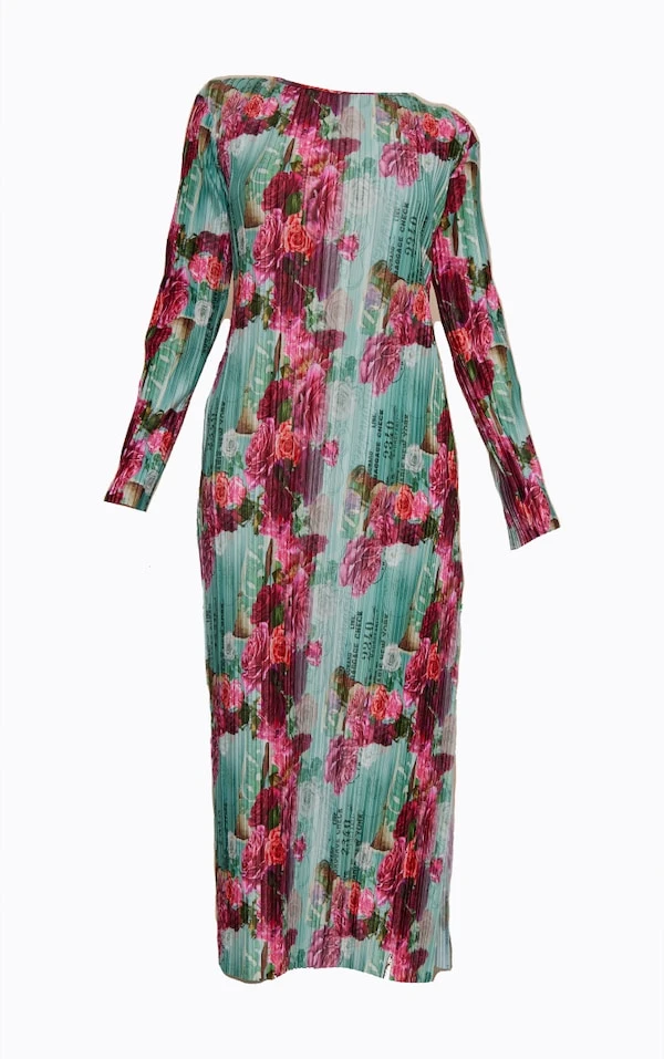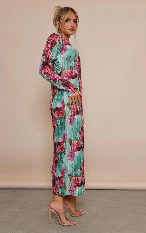 Robe mi-longue plissée rose imprimé roses à manches longues et fente