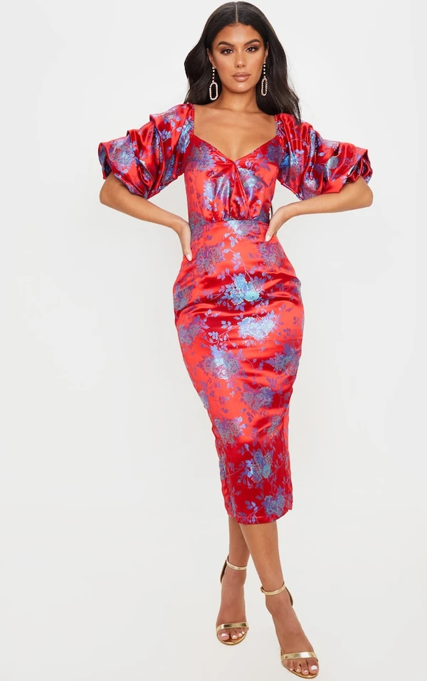 Robe mi-longue rouge en jacquard floral à laçage au dos