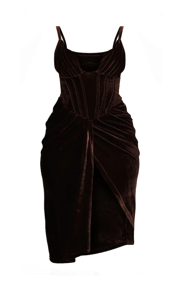 Robe mi-longue style corset drapée en velours chocolat à buste plissé
