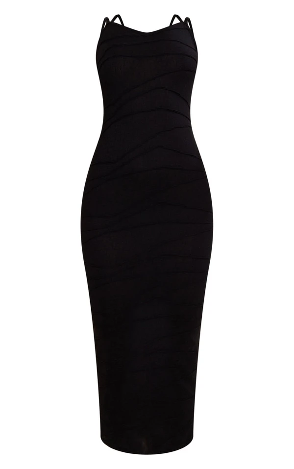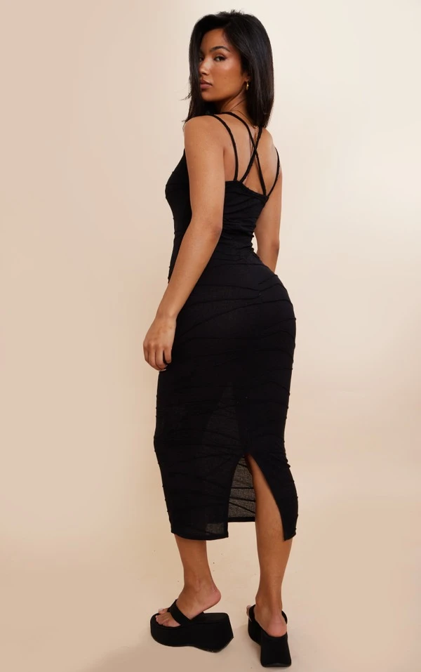 Robe mi-longue texturée noire à doubles bretelles